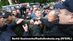 Колонна из около 500 человек выдвинулась по улице Мазепы от станции метро «Арсенальная» в сторону парка Славы – впереди колонны находилось тройное полицейское оцепление.