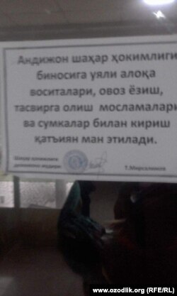 Накануне при входе в здание хокимията (администрации) города Андижана появилось объявление, в котором написано, что «в здание категорически запрещается входить с сотовыми телефонами, а также аудио и видео устройствами».