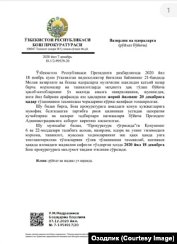 В официальном письме, копия которого оказалась в распоряжении редакции «Озодлика», говорится, что Генеральная прокуратура взяла под свой контроль вопрос по обеспечению выплаты зарплат до 20 декабря этого года.