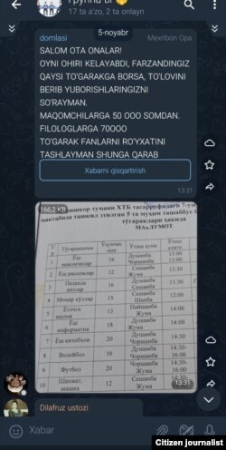 – В Telegram-группе родителям написали, что в рамках «пяти инициатив президента» создан кружок. Сообщили, что педагог хорошо обучает и что дети могут посещать занятия на добровольной основе. Но потом нас попросили ежемесячно платить по 40 тысяч сумов за занятия в этом кружке. Куда деваться, мне пришлось заплатить…, – сказала женщина и отправила в редакцию «Озодлика» скриншот сообщения о необходимости оплатить занятия в кружке.