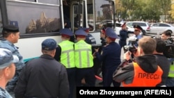 В Шымкенте, как сообщает корреспондент «Азаттыка», полиция задержала нескольких человек на подступах к площади Ордабасы, проходы к которой с утра были оцеплены полицией. Среди задержанных оказались люди, сидевшие на автобусной остановке, которые говорили, что не собираются протестовать. Полицейские задержали женщину с несовершеннолетним ребенком, передает репортер.